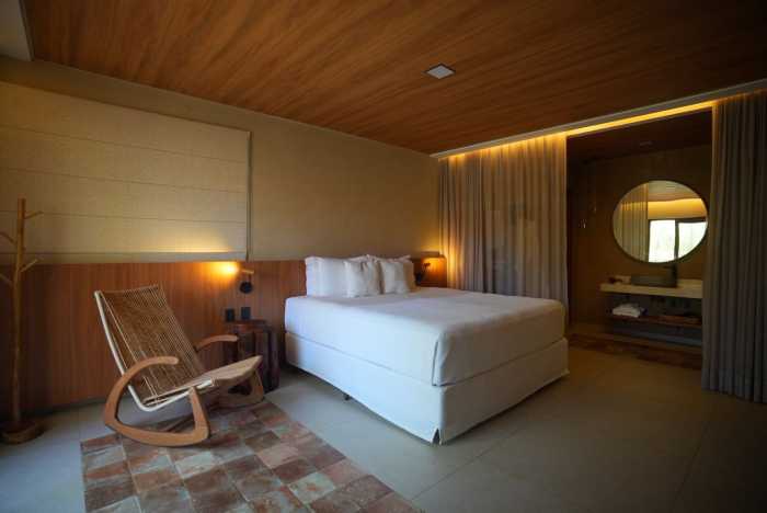 A identidade estética da pousada foi construída a partir de uma curadoria cuidadosa. Tons de areia, verde e elementos naturais compõem a paleta visual, enquanto materiais como madeira, palha e fibras orgânicas criam uma atmosfera que dialoga diretamente com a paisagem de Noronha. A arte ocupa papel central na narrativa do espaço. Obras assinadas por artistas e artesãos pernambucanos ajudam a construir uma experiência sensorial que conecta o hóspede à cultura local, criando ambientes onde cada peça carrega história e significado.