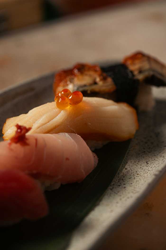 A Centolla com manteiga e katsuobushi revela camadas delicadas e refinadas, enquanto o Olho de Boi impressiona pela textura sedosa e sabor profundo. O Unagui traz a clássica enguia com notas levemente adocicadas e defumadas, e a Vieira reforça o domínio técnico da casa em preparos que exigem precisão absoluta. O Carapau completa a seleção com leveza e frescor, evidenciando cortes limpos e execução impecável.
