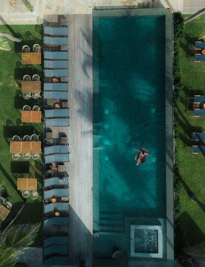 A estrutura acompanha o posicionamento. Piscina com vista para o oceano, spa, academia e um wine lounge com proposta de autoatendimento criam uma dinâmica onde o conforto existe sem rigidez. O hotel funciona quase como uma extensão do estilo de vida de quem se hospeda, sem formalidades desnecessárias.