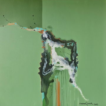Executadas em óleo e acrílica sobre tela, as obras se destacam pela fluidez das formas e pela intensidade cromática, criando superfícies que parecem pulsar. Há uma construção visual que remete ao orgânico, onde camadas se sobrepõem de maneira espontânea, revelando um processo que valoriza o percurso tanto quanto o resultado final.